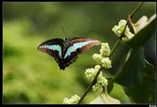 青带凤蝶Graphium sarpedon ,又名青凤蝶,是最普遍的中型凤蝶,飞行速度很快。青带凤蝶的翅膀中央有许多浅蓝色的斑点,很整齐地排列成一条直线。这些斑点由上而下逐渐变大,就像一条青色的带子。全部>>