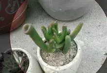 筒叶花月,是景天科青锁龙属的多年生草本植物。植株多分株,灌木状,茎较粗壮,圆柱形,表皮灰褐色;叶片肉质,互生,呈圆筒状,簇生于茎或分枝顶端,叶端呈斜截形,截面为椭圆形;花呈星状,淡白色;花期秋季。…全部>>