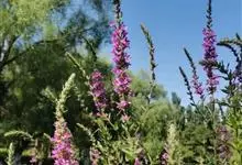 千屈菜是千屈菜科千屈菜属的多年生草本植物;根茎粗壮;叶披针形或宽披针形,无柄;花序簇生,呈聚伞状,花梗及花序梗甚短,花枝似一大型穗状花序,红紫色或淡紫色,苞片宽披针形或三角状卵形;果实为蒴果,扁圆形。…全部>>