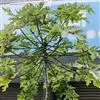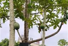 番木瓜,番木瓜科番木瓜属的常绿软木质小乔木,高达10米,具有乳汁;茎不分枝或有时于损伤处分枝;叶大且聚生于茎顶,近似盾形,叶柄中空;花单性或两性,有些品种雄株偶尔生两性花或雌花,…全部>>