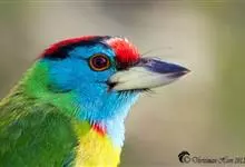 蓝喉拟啄木鸟,是须鴷科、拟啄木鸟属的鸟类。蓝喉拟啄木鸟为小型鸟类,体长20-23厘米。前额至头顶鲜红色,其上有一宽阔的黑色横带,将此红色分为前后二块;头侧、颏、喉蓝色,下喉两侧各具一红色点斑。…全部>>