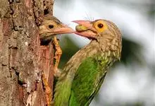 绿拟啄木鸟为鴷形目,须科,拟啄木属的一种。形较大拟啄木鸟略小,体长约260mm。头、颈及胸浅褐而具淡黄白色条纹;喉几为淡黄白色;身体余部草绿色。虹膜棕褐色,眼周裸露部黄色;嘴峰角黄色;跗跖和趾角黄…全部>>