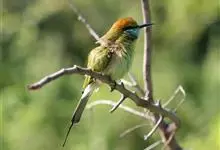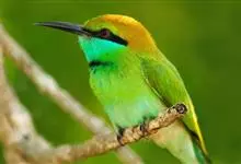 绿喉蜂虎是佛法僧目、蜂虎科的小型鸟类,共有9个亚种。身长22-25厘米,翼展29-30厘米,体重15-20克。喉绿色,额部、头顶至上背为锈红色,其余上体均为亮绿色。中央尾羽延长且端段狭细,…全部>>