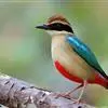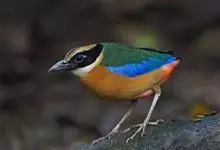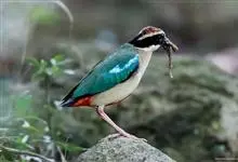 蓝翅八色鸫是雀形目八色鸫科的鸟类。体长17-20厘米,体重类约48-70克,体型圆胖,尾短,腿长,以身体具有红、绿、蓝、白、黑、黄、褐、栗等鲜艳夺目,丰富艳丽的色彩而得名,是很有观赏价值的鸟类。主要…全部>>