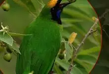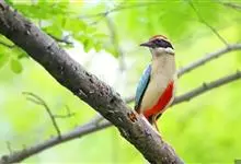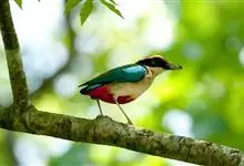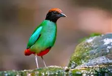 绿胸八色鸫:是雀形目八色鸫科的鸟类,共有12个亚种。体长为16-18厘米,体重65-69克。体型圆胖,尾短,腿长。头黑,上体绿色,两翼深色而具白色斑纹,头顶至后枕深褐,胸及腹部苹果绿,臀亮红。…全部>>