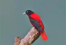 朱鹂:中等鸟类,体长23-28厘米。雄鸟绛紫红色,头、上胸及翼黑色。雌鸟上背及背部深灰色,尾覆羽及尾绛紫红色,腹部及下胸白而密布黑色纵纹。与鹊色鹂幼鸟的区别在上背灰色较深,下体白色较少且纵纹较粗。…全部>>