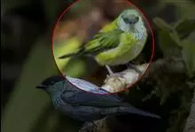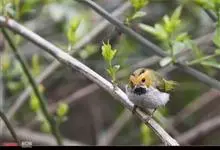 黑脸鹟莺:体长10厘米,是有特色的体小而多彩的莺鸟。粗眉纹,颏、喉及尾下覆羽黄色,脸罩黑,头顶及颈背灰色,上体绿,无翼纹,腹白。虹膜褐色;上嘴色深,下嘴肉色;脚偏绿色。…全部>>