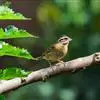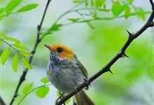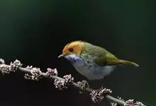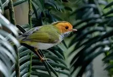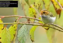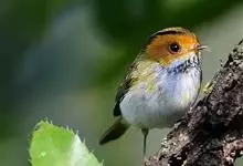 棕脸鹟莺:体长10厘米,是一种色彩亮丽而有特色的莺鸟。头栗色,具黑色侧冠纹。上体绿,腰黄色。下体白,颏及喉杂黑色点斑,上胸沾黄。与栗头鹟莺的区别在头侧栗色,白色眼圈不显著且无翼斑。…全部>>