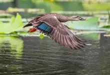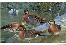 绿翅鸭是小型鸭类,体长37厘米,体重约0.5千克。嘴脚均为黑色。雄鸟头至颈部深栗色,头顶两侧从眼开始有一条宽阔的绿色带斑一直延伸至颈侧,尾下覆羽黑色,两侧各有一黄色三角形斑,在水中游泳时,极为醒目。…全部>>