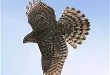 褐耳鹰的体形比苍鹰要小得多,为小型猛禽,体长为31-44厘米,体重217-325克。上体灰色,下体具赤褐色横斑。第6枚初级飞羽外羽片无缺刻,次外侧的4对尾羽具5道黑褐色横斑。眼先具白色短羽。…全部>>