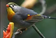 银耳相思鸟小型鸟类,体长14~18厘米。头顶黑色,耳羽银灰色,前额橙黄色;外侧飞羽橙黄色,基部朱红色,极为鲜艳、醒目。尾圆形,尾上、尾下覆羽朱红色,尾暗灰褐色,外侧尾羽橙黄色,其余上体橄榄绿或橄榄黄色。…全部>>