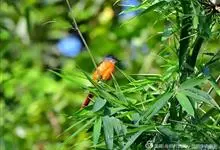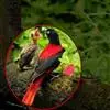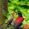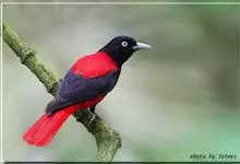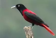 朱鹂:中等鸟类,体长23-28厘米。雄鸟绛紫红色,头、上胸及翼黑色。雌鸟上背及背部深灰色,尾覆羽及尾绛紫红色,腹部及下胸白而密布黑色纵纹。与鹊色鹂幼鸟的区别在上背灰色较深,下体白色较少且纵纹较粗。…全部>>