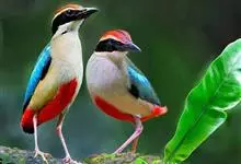 绿胸八色鸫:是雀形目八色鸫科的鸟类,共有12个亚种。体长为16-18厘米,体重65-69克。体型圆胖,尾短,腿长。头黑,上体绿色,两翼深色而具白色斑纹,头顶至后枕深褐,胸及腹部苹果绿,臀亮红。…全部>>