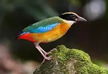 蓝翅八色鸫是雀形目八色鸫科的鸟类。体长17-20厘米,体重类约48-70克,体型圆胖,尾短,腿长,以身体具有红、绿、蓝、白、黑、黄、褐、栗等鲜艳夺目,丰富艳丽的色彩而得名,是很有观赏价值的鸟类。主要…全部>>