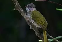 灰短脚鹎,体长19-22厘米。头顶和短的羽冠黑色,上体暗灰色,耳羽灰褐色,两翅表面橄榄绿黄色。大覆羽和内侧飞羽外翈橄榄黄色,在翅上形成大块绿黄色斑,在灰色的上体极为醒目。尾暗褐色具橄榄绿色羽缘。…全部>>