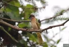 绿翅短脚鹎是鹎科、短脚鹎属的鸟类。共有9个亚种。中型鸟类,体长20-26厘米。头顶羽毛形尖、栗褐色具白色羽轴纹,在暗色的头部极为醒目。上体灰褐缀橄榄绿色,两翅和尾亮橄榄绿色。耳和颈侧红棕色,颏、喉灰色,…全部>>