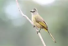 黄绿鹎,小型鸟类,体长19-22厘米。额至头顶暗褐具灰色羽缘,眼先黑色,其上面有一粗著的白纹从鼻后至眼,在黑色的头部极为醒目。上体橄榄绿褐色。颏、喉淡灰色或灰白色,胸灰褐色具橄榄黄色羽缘,…全部>>