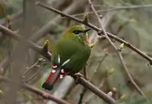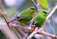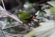 火尾绿鹛是莺科、绿鹛属小型鸟类,体长11-14厘米。上体绿色,头顶至枕具黑色鳞状斑,眼先和眼后黑色,眉纹黄绿色。两翅黑色具黄色和红色翅斑及白色端斑,极为醒目。中央一对尾羽绿色,外侧尾羽鲜红色。…全部>>
