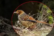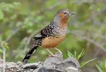 大噪鹛:中型鸟类,体长32-36厘米。额至头顶黑褐色,背栗褐色满杂以白色斑点,斑点前缘或四周还围有黑色。初级覆羽、大覆羽和初级飞羽具白色端斑。尾特长,均具黑色亚端斑和白色端斑。颏、喉棕褐色,…全部>>