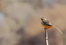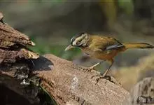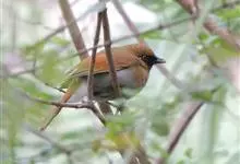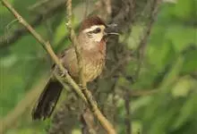 白颊噪鹛是雀形目噪鹛科噪鹛属鸟类,又称土画眉、小画眉、小噪鹃。成鸟额至头顶栗褐色,长眉纹、眼先和颊纹棕白色,眼后至耳羽深褐色,…全部>>