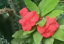 虎刺梅:别称铁海棠,是蔓生灌木植物。茎多分枝,长60-100厘米,直径5-10毫米,具纵棱,密生硬而尖的锥状刺,刺长1-1.5厘米,直径0.5-1.0 毫米,常呈3-5列排列于棱脊上,呈旋转。叶互生…全部>>