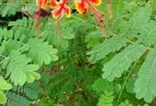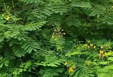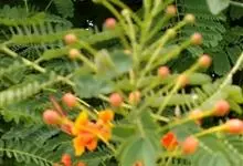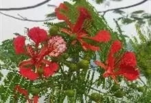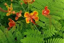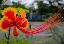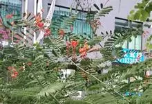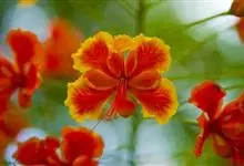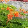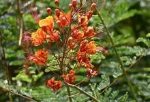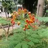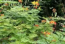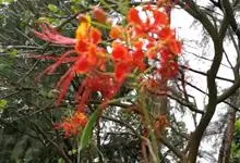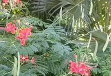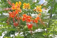 洋金凤 Sw.),豆科小凤花属灌木状或小乔木植物,枝无毛,绿或粉绿色;二回羽状复叶;总状花序伞房状,萼片无毛,花瓣橙红或黄色,圆形,花丝红色,子房无毛,花柱橙黄色;荚果窄而薄,…全部>>