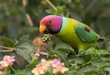 紫红头鹦鹉是鹦形目鹦鹉科的鸟类。鸟体为绿色,头部中间为红色,下颏下方延伸到脸颊下方,环绕整个颈部有一条黑色的环状羽毛,并连接一条蓝绿色的条状羽毛。…全部>>