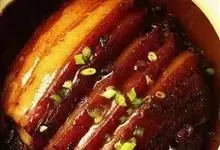 梅菜扣肉,汉族传统名菜,属客家菜。制作材料有五花肉、梅菜、葱白、姜片等。通常是将五花肉上汤锅煮透,加老抽,油炸上色,再切成肉片。之后加葱、姜等调料炒片刻,再下汤用小火焖烂,五花肉盛入碗里,上铺梅菜段,…全部>>