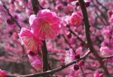 宫粉梅 Rehd.)是蔷薇科、李属植物,梅花品系中真梅系直枝梅类宫粉型,其花复瓣至重瓣,呈或深或浅的红色。落叶乔木,高达10米。树干褐紫色,有纵驳纹,小枝细而无毛,多为绿色。叶广卵形至卵形,…全部>>