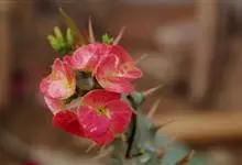 铁海棠为大戟科大戟属蔓生灌木植物;茎多分枝,具纵棱,呈旋转状;叶互生,通常集中于嫩枝上;每个花序基部边缘具微小的红色尖头;苞叶先端圆且具小尖头,无柄,上面鲜红色,下面淡红色;苞片丝状;子房光滑无毛,…全部>>