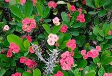 虎刺梅:别称铁海棠,是蔓生灌木植物。茎多分枝,长60-100厘米,直径5-10毫米,具纵棱,密生硬而尖的锥状刺,刺长1-1.5厘米,直径0.5-1.0 毫米,常呈3-5列排列于棱脊上,呈旋转。叶互生…全部>>