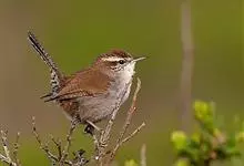 鹪鹩属:是一类小型鸣禽,身长在10-17厘米之间。头部浅棕色,有黄色眉纹;上体连尾带栗棕色,布满黑色细斑;两翼覆羽尖端为白色。整体棕红褐色,胸腹部颜色略浅,翅膀有深色波形斑纹,嘴长直而较细弱,先端稍曲,…全部>>