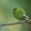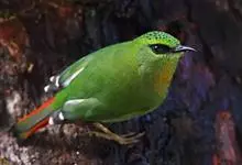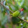 火尾绿鹛是莺科、绿鹛属小型鸟类,体长11-14厘米。上体绿色,头顶至枕具黑色鳞状斑,眼先和眼后黑色,眉纹黄绿色。两翅黑色具黄色和红色翅斑及白色端斑,极为醒目。中央一对尾羽绿色,外侧尾羽鲜红色。…全部>>