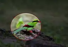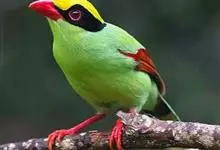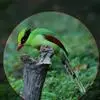 蓝绿鹊:中型鸟类,共有5个亚种。体长36-38厘米。尾长,嘴、脚红色。通体羽色主要为草绿色,宽阔的黑色贯眼纹向后延伸到后颈,在绿色的头侧极为醒目。两翅栗红色,内侧飞羽具黑色次端斑和白色尖端。尾绿色,…全部>>