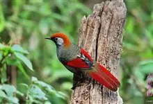 赤尾噪鹛中型鸟类,体长24~28厘米。头顶至后颈红棕色,两翅和尾鲜红色,眼先、眉纹、颊、颏和喉黑色,眼后有一灰色块斑。其余上下体羽大都暗灰或橄榄灰色。特征极明显,特别是通过鲜红色的头顶、翅和尾。…全部>>