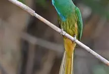 黄喉蜂虎属中型鸟类,体长23-30厘米。喉黄色,其下有一窄的黑色胸带;胸带以下的整个下体蓝绿色。前额蓝白色,具一宽的黑色贯眼纹,头顶至后颈暗栗色,尾蓝绿色,中央尾羽延长,明显突出于其他尾羽。…全部>>