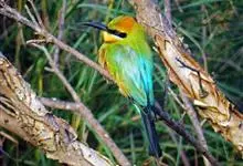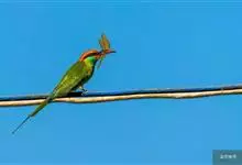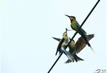栗喉蜂虎是蜂虎科蜂虎属的鸟类。有热带鸟类羽毛艳丽的特征:喉部是栗红色的,黑色的过眼纹,翅膀和背部是绿色的,尾翼是蓝色的,飞行时翅膀下面的羽毛是橙黄色的,在阳光的照射下,它们全身闪烁着金属般的艳丽光泽,…全部>>
