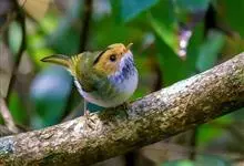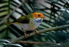 棕脸鹟莺:体长10厘米,是一种色彩亮丽而有特色的莺鸟。头栗色,具黑色侧冠纹。上体绿,腰黄色。下体白,颏及喉杂黑色点斑,上胸沾黄。与栗头鹟莺的区别在头侧栗色,白色眼圈不显著且无翼斑。…全部>>