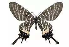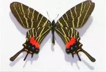 大二尾蛱蝶两翅正面黑色,中域有一浅绿色大型宽带纹,两翅反面浅绿色,中域有一缀黑边的褐色弧纹,亚外缘还有一深褐色横纹,后翅各有尾突两条,…全部>>