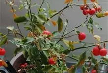 珊瑚樱是茄科茄属植物。株高达2米;植株无毛;叶窄长圆形或披针形,长1-6厘米,基部窄楔形下延,全缘或波状,侧脉4-7对;叶柄长2-5毫米;花单生,稀双生或成短总状花序与叶对生或腋外生,…全部>>