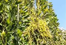 槐 Schott),豆科槐属的落叶乔木。树皮暗灰色,树冠球形,老时则呈扁球形或倒卵形。枝叶密生,羽状复叶。圆锥花序顶生,花蝶形,夏季开黄白色花,略具芳香。荚果肉质,念珠状不开裂,黄绿色,常悬垂树梢,…全部>>