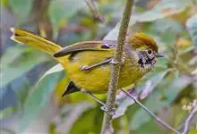 斑喉希鹛小型鸟类,体长14~17厘米。头具羽冠,前额和头顶羽冠金黄褐色,头侧灰黄色具黄色眼圈。上体灰橄榄绿色,外侧飞羽表面橘黄色、基部具黑色翼斑;内侧飞羽表面淡灰色具黑色亚端斑和白色端斑。尾羽黑色,…全部>>