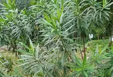 白花夹竹桃是夹竹桃科、夹竹桃属植物夹竹桃的栽培品种。常绿直立大灌木,枝条灰绿色;嫩枝条具稜,被微毛,老时毛脱落。叶3-4枚轮生,下枝为对生,叶面深绿,叶背浅绿色;侧脉纤细平行与中脉成直角;叶柄扁平,…全部>>