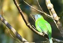 橙腹叶鹎体形大小和金额叶鹎相似,体长16~20厘米。额至后颈黄绿色,其余上体绿色,小覆羽亮钴蓝色,形成明显的肩斑。颏、喉、上胸黑色具钴蓝色髭纹,其余下体橙色。飞羽和尾羽雄鸟黑色、雌鸟绿色。…全部>>