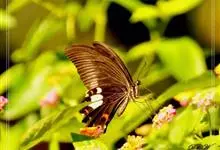 金凤蝶,是鳞翅目凤蝶科凤蝶属动物。金凤蝶为中型凤蝶,翅展70-84毫米,翅背面底色黑褐色,翅脉黑色,翅室具黄斑;前翅背面基部呈暗黄色,亚外缘为黑色,内具一列小黄斑;后翅背面亚外缘区具黑宽边,…全部>>