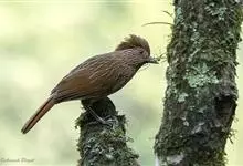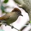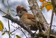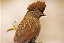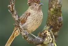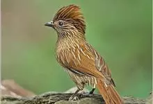 条纹噪鹛是画眉科、噪鹛属中型鸟类,体长28-32厘米。头具短的羽冠,上体栗褐色,飞羽外翻蓝灰色。下体棕栗色,腹以后转为褐白色。除飞羽和尾羽外,所有上、下体羽均具白色羽干纹。极为醒目。野外特征明显,…全部>>