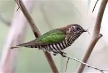 翠金鹃体长约17厘米,雄鸟上体辉绿色,头至背缀有很多棕栗色,颏和喉具黑褐色横斑;雌鸟上体自背以下具棕色羽缘。虹膜淡红褐色至绯红色,眼圈绯红色,嘴亮橙黄色,尖端黑色,脚暗褐绿色。…全部>>