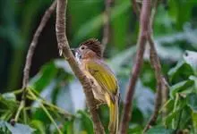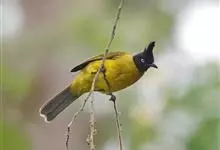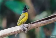 黑冠黄鹎:体长18-21厘米,是一种中等体型偏黄色鹎。整个头、颈、颏、喉黑色,头顶有显著直立的羽冠,黑色,上体褐橄榄黄绿色,下体橄榄黄色。虹膜偏红;嘴及脚黑色。…全部>>