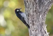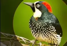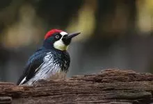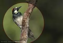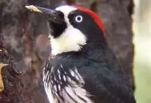 橡树啄木鸟:体长20-23厘米。前额灰黄色,头顶、后颈红色。喉下部、腰和腹部白色,腹部有细的黑色纵条纹。其余体羽为黑色。嘴黑色。腿、脚暗灰色。栖息于山区林地中。结群活动。以昆虫以及植物坚果、果实等为食。…全部>>