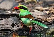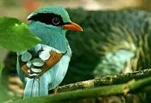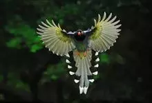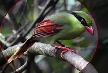蓝绿鹊:中型鸟类,共有5个亚种。体长36-38厘米。尾长,嘴、脚红色。通体羽色主要为草绿色,宽阔的黑色贯眼纹向后延伸到后颈,在绿色的头侧极为醒目。两翅栗红色,内侧飞羽具黑色次端斑和白色尖端。尾绿色,…全部>>